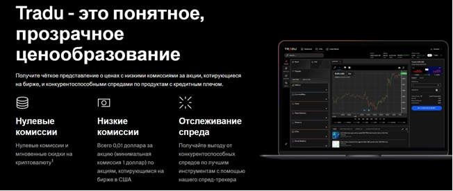 По словам владельцев биржи, Tradu broker выступает за понятное и прозрачное ценообразование. Фирма обещает клиентам низкие комиссии и скидки на криптовалюту. За акцию компания взимает всего 0,01 доллара. Пользователи также могут получить выгоду от спредов с помощью специального спред-трекера.
