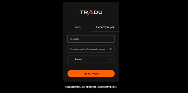 Сайт Tradu является открытой площадкой. Любой заинтересовавшийся пользователь может ознакомиться с основной информацией о бирже. Но для начала торговли клиенты должны пройти регистрацию. Для этого следует лишь указать адрес электронной почты, выбрать страну и придумать пароль.
