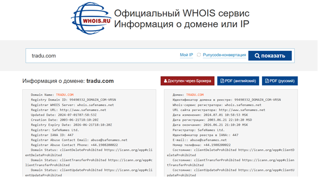 Доменный адрес tradu com создан 21 июня 2003 года. Как мы видим, площадка Tradu broker действительно функционирует более 20 лет. Но серьезные подозрения в мошенничестве вызывает отсутствие любых комментариев и отзывов о брокере в интернете. В июле 2024 года в домен были внесены изменения. Срок регистрации платформы закончится в июне 2026 года. Не исключено, что компания Tradu приобрела доменный адрес у предыдущего собственника. Таким образом лжеброкер создает видимость огромного опыта работы.