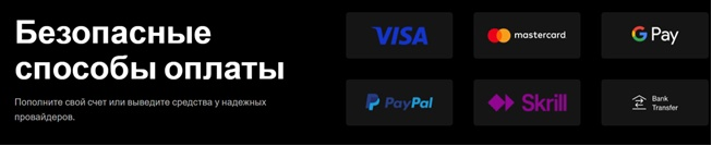 Компания Tradu использует для работы безопасные способы оплаты. Пополнить счет или вывести средства пользователи могут у таких провайдеров, как VISA, MasterCard, GooglePay, PayPal и других.