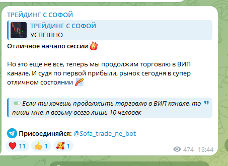 Контент канала в Телеграмм «Трейдинг С Софой» в основном состоит из мотивационных сообщений, скриншотов «успешных сделок» и призывов присоединиться к VIP-клубу. Это не образовательный ресурс и не площадка с сигналами, а инструмент для вовлечения новых клиентов в сомнительный проект.