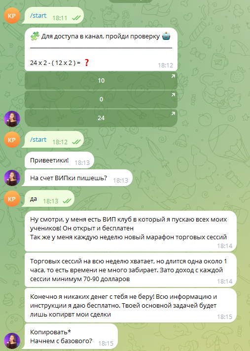 Для доступа к контенту бота пользователи должны решить простую математическую загадку, после этого приходит несколько вводных сообщений от Софии. Основной посыл – пользователи якобы могут зарабатывать с каждой сессии $70-90.