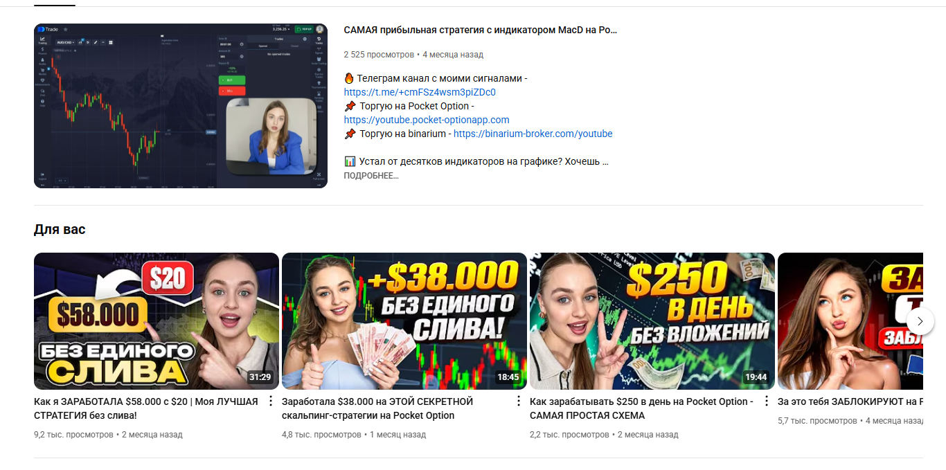 В Ютубе София два раза в месяц публикует видео, в которых рассказывает, как она заработала от $250 в день до $30,000 в месяц «без единого слива». Но эти ролики не демонстрируют трейдинг в прямом эфире и не содержат ссылки на верификаторы.