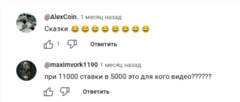 Часть пользователей с иронией называет контент «сказками» и «цирком», указывая на нелепые размеры ставок и поддельные графики. Другие комментаторы жалуются на отсутствие обещанных функций и нестабильность предлагаемых стратегий.