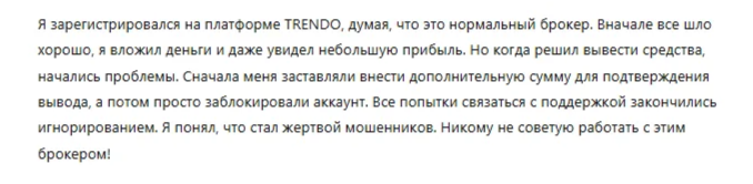 Комментариев о платформе «Трендо» немного, но все они характеризуют контору отрицательно. Юзеры утверждают, что при попытке вывести средства система просит оплатить дополнительные комиссии. Но и после внесения всех сборов клиенты не получают деньги. Их блокируют, а на вопросы и жалобы никто не реагирует.