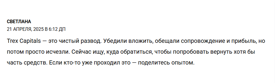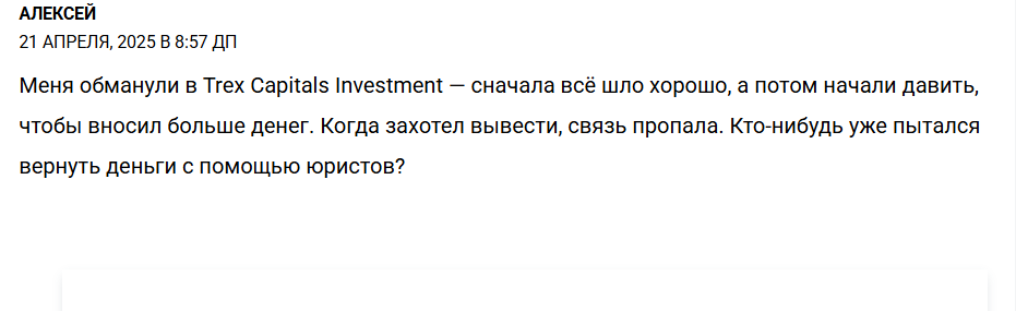 Мы не рекомендуем брокера trex capitals investment. Это лохотрон. Если вы уже работали с сервисом, оставляйте комментарий. А у нас еще много текстов о самых разных финансовых организациях, которые принесут вам пользу.