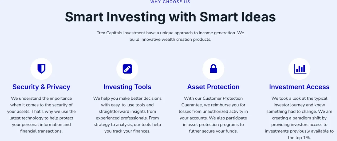 Разработчики trex capitals investment называют своими преимуществами безопасность и защищенное хранилище, удобные инструменты, доступ к прибыльным инвестициям. Есть разные варианты сотрудничества, которые отличаются доходностью: от 20% за 12 дней до 80% за 72 дня.