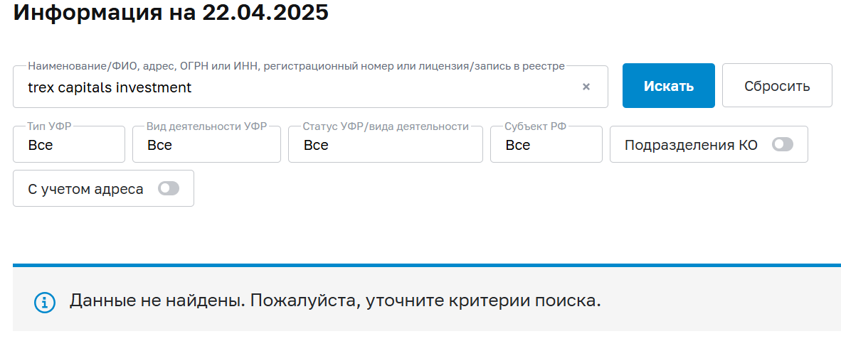 Уверенно можно сказать: trex capitals investment нет среди участников российского рынка. Это показала проверка на сайте ЦБ России. Если вы не сможете вывести деньги, восстановить справедливость по закону нашей страны будет трудно.
