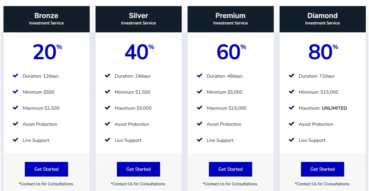 Компания предлагает 4 тарифных плана на выбор: Bronze, Silver, Premium, Diamond. На 12, 24, 48 и 72 дня. Минимальный депозит – 500, максимальный – 15 тыс долларов. Обо всем можно поговорит с менежером. Но его цель – заставить пополнить баланс на как можно большую сумму. Настоящей заботы о клиентах здесь нет, только показуха. Те, кто завел здесь кошелек, имеют большой шанс потерять деньги.