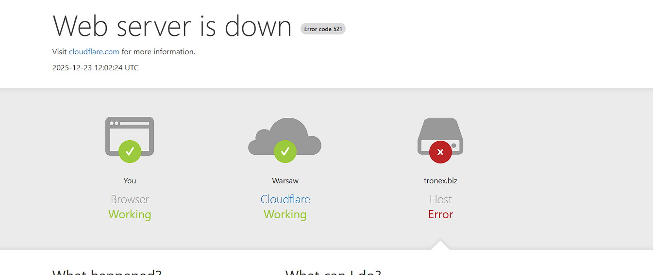 Tronex – это криптовалютная биржа неизвестного происхождения. Судя по возрасту домена, она появилась в конце октября 2025 года. И к настоящему времени уже прекратила свое существование – так выглядит сайт “Тронекс” сейчас: