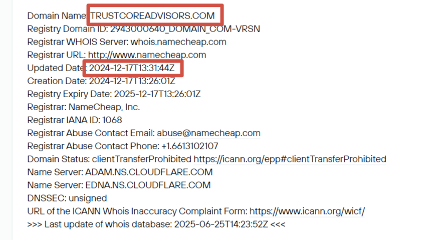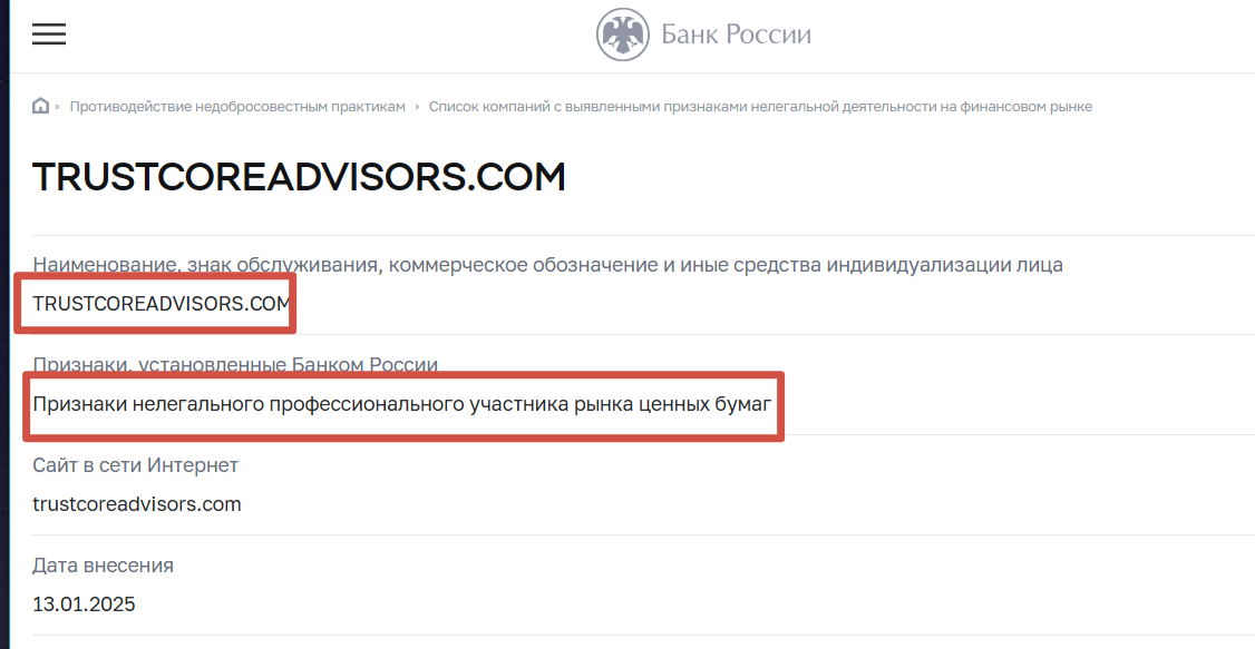 Ознакомиться с деятельностью инвестиционной платформы можно на официальном сайте trustcoreadvisors com. Проверка показала, что домен создан осенью 2024 года. Это противоречит заявлениям владельцев о многолетнем опыте работы.