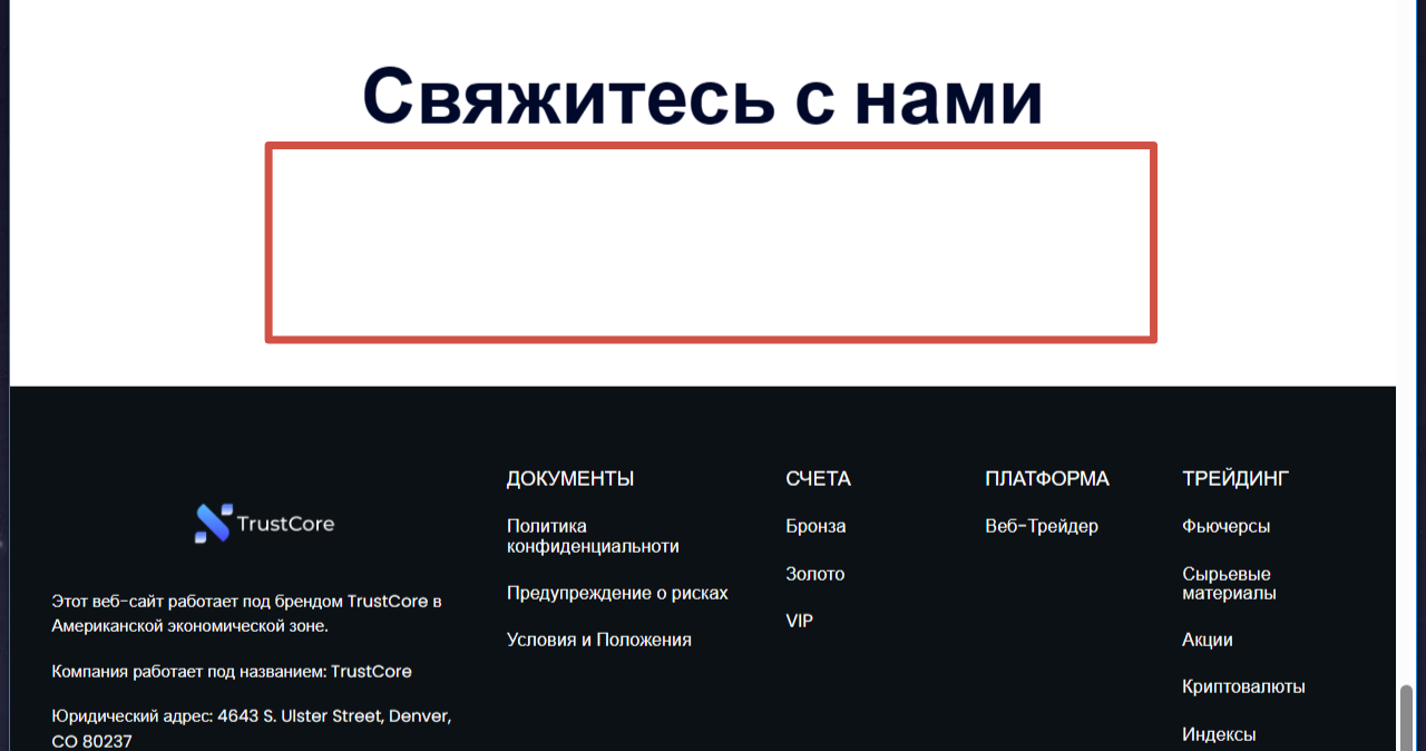 Веб-ресурс представляет собой типичный лендинг с минимумом информации. Большая часть пространства отдана под рекламные лозунги без какой-либо конкретики. В качестве владельца компании указан некий Себастьян Блаквел. Нам не удалось найти бизнесменов или трейдеров с таким именем. Указано, что головной офис расположен в США, в Денвере. Однако по указанному адресу нет компаний с таким названием. Также нет сведений о лицензии брокера. Проверка реестров Центробанка РФ показала, что сайт брокера Trustcoreadvisors Com внесен в черный список. Регулирующие органы установили, что компания имеет признаки нелегального профессионального участника рынка ценных бумаг. Это означает, что любая деятельность компании в нашей стране незаконна.