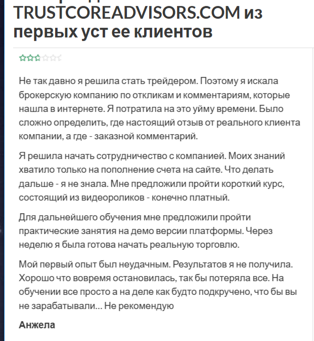 Разумеется, что все вышеперечисленное свидетельствует о том, что брокер Trustcoreadvisors Com мошеннический проект. Мы не рекомендуем сотрудничать с этой площадкой. Если вы пострадали от действий лжеброкера, расскажите об этом в комментариях. Ваш опыт послужит предупреждением для других пользователей.