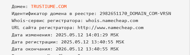 На странице платформы в интернете нет данных о создателях компании, однако присутствует информация, что сервис работает более 10 лет. По итогам проверки становится ясно, что сайт TrustIume com начал работу только в мае 2025 года, клиентам намеренно предоставляют фейковые сведения.