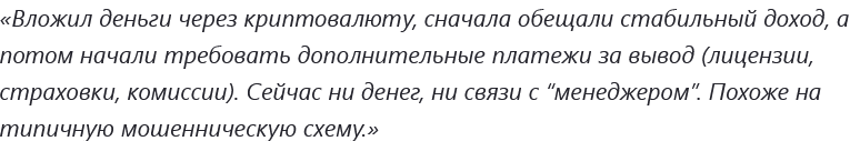 На странице проекта в интернете отклики юзеров не публикуются, на специализированных площадках можно встретить только негативные оценки деятельности ресурса. Люди рассказывают о том, что менеджеры обещают стабильный доход, а после создания заявки на вывод начинают требовать уплату комиссии и иных дополнительных платежей, а в итоге производят блокировку аккаунта.