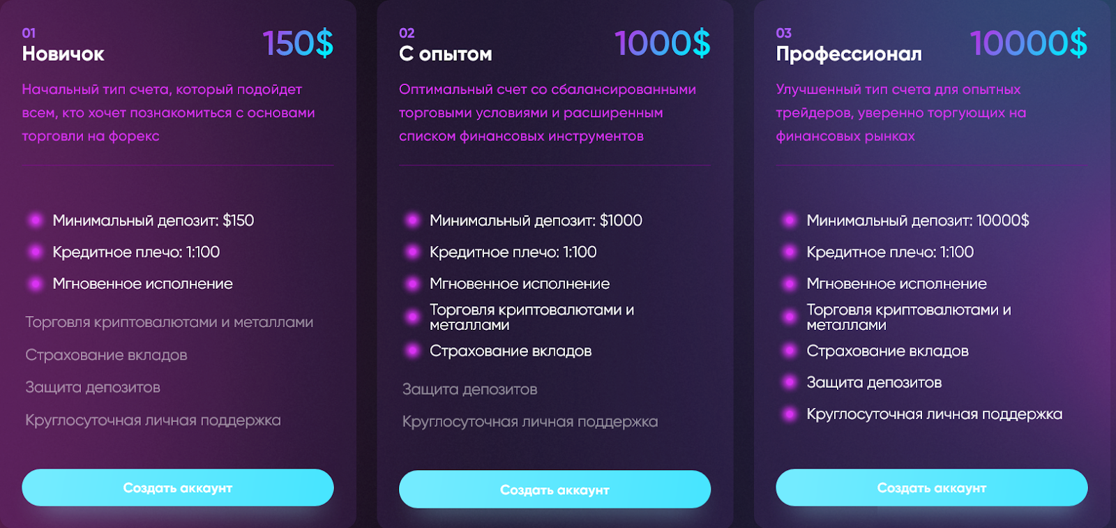 Кредитное плечо по всем тарифным планам 1:100, о спредах данных нет, также неизвестно, каким образом можно пополнить депозит, информация о комиссиях, обслуживании счета и платежном терминале отсутствует.