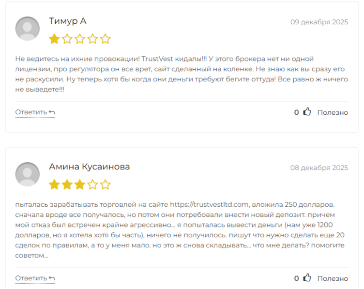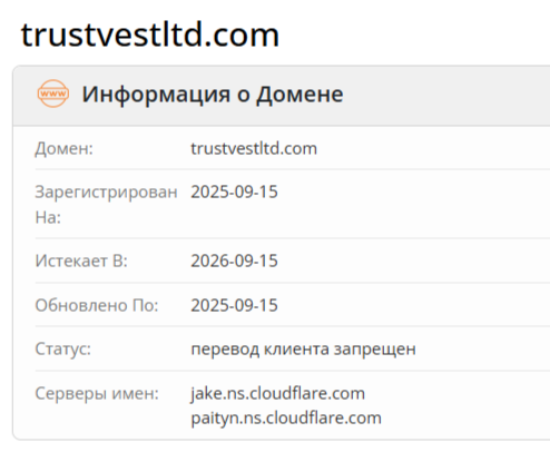 В процессе обследования веб-сайта брокера trustvestltd com нами получены следующие результаты. Домен посредника обосновался в мировой паутине 15 сентября 2025 года. На момент обзора фейковой брокерской организации исполнилось всего 3 месяца. Название компании отсутствует в реестре CySEC. Деятельность посредника нелегальна на территории России, так как не регулируется ЦБ РФ. Все перечисленные выше факты говорят об обычном мошенничестве и разводе со стороны очередных аферистов.