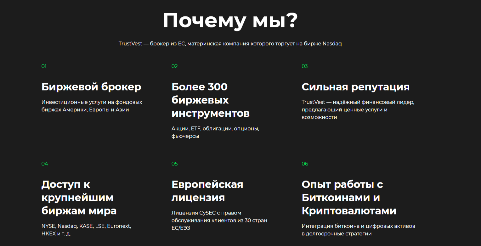 TrustVest – брокер из ЕС, открывающий трейдерам доступ к крупнейшим биржам мира. Данный посредник предлагает желающим заработать сделки с 300+финансовыми инструментами. Брокерская организация обещает будущим клиентам лучшие спреды и лояльные комиссии. Возможен ли прибыльный трейдинг с упомянутым проектом – читайте в нашем новом обзоре.