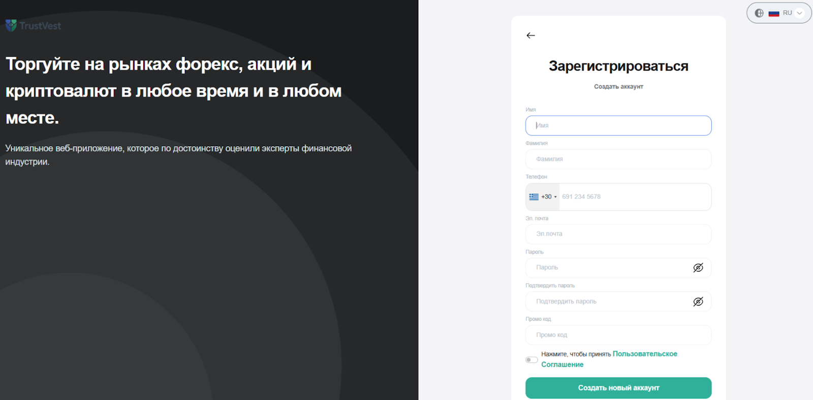 Трейдинг на сайте брокерской организации «Траст Вест» доступен зарегистрированным пользователям. Создать аккаунт просто. Нажмите кнопку «Вход», заполните анкету: имя, фамилия, телефон, имейл, пароль, промокод. Использование специального кода не является обязательным. После регистрации следует верификация на портале и внесение на баланс от 100 долларов. Таков минимальный депозит у данного брокера.