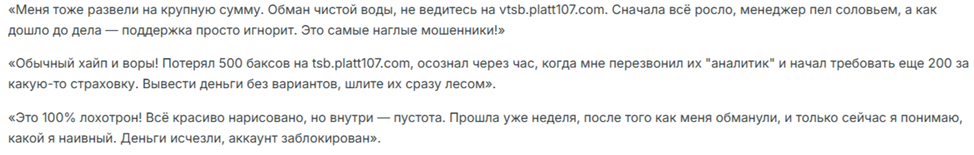 Отзывы о компании Tsb Platt127 Com отрицательные. Пользователи пишут о больших финансовых потерях. Этот проект является скамом, так как он принимает деньги, но не выводит заработанные средства. В отзывах указано о невозможности получать прибыль с помощью сайта этой брокерской компании.