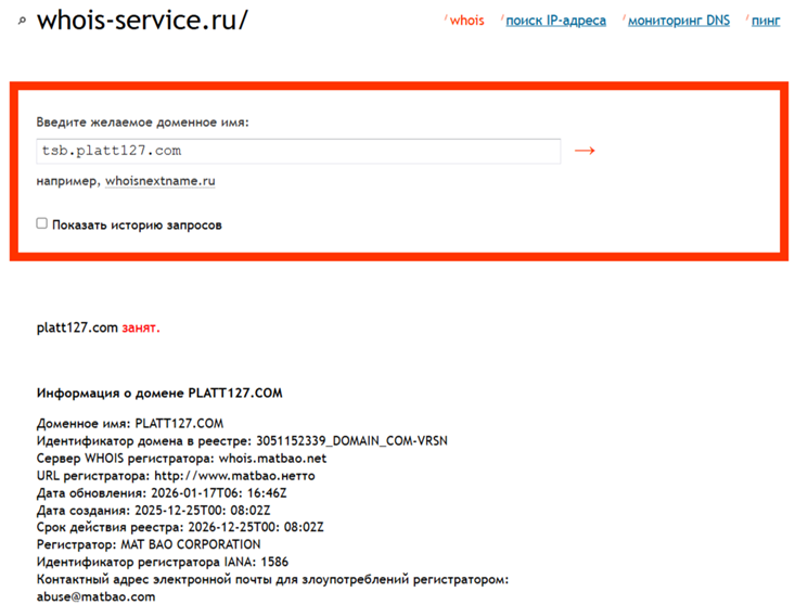 На сервисе указано, что брокер работает с 2006 года. Проверка доменного имени сайта Tsb Platt127 Com показала, что он зарегистрирован в декабре 2025 года. Это небольшой срок работы для финансовой площадки. Маленький «возраст» свидетельствует о мошенничестве. Согласно данным проверки, доменный адрес продлен до 25.12.2026 г.
