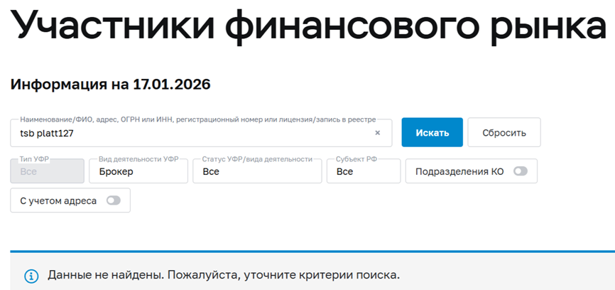 У брокерской компании «Тсб Платт127 Ком» нет лицензии ЦБ РФ, а также нет официального разрешения от иностранных регуляторов. Деятельность этой площадки в России незаконная. Компания не может оказывать брокерские услуги, а у клиентов отсутствует правовая защита. Вся информация о международной регистрации является ложной.Схема обмана на Tsb Platt127 Com простая. Клиенту обещают огромный доход и личное сопровождение. Когда зачислен первый депозит, пользователя убеждают в необходимости еще перевести средства. А если подать заявку на вывод, нужно якобы уплатить комиссию или налоги. При отказе оплатить аккаунт блокируется.