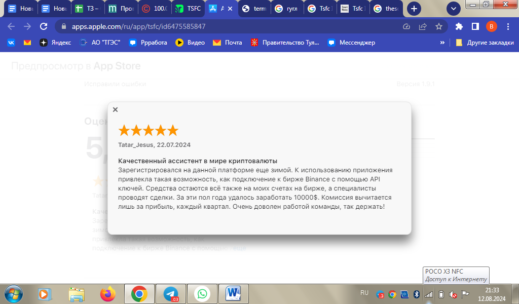 Один из пользователей поделился мнениями в карточке приложения в App Store. Инвестор остался доволен доходностью и подтвердил возможность торговли на Binance. Кроме того, клиент подтверждает наличие команды трейдеров, позволяющих завершать сделки с плюсом.