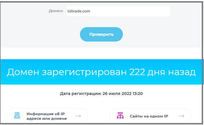 Брокерский портал имел далеко не оригинальный дизайн, разделы в шапке «Дом», «Торговля», «Продукты», «О нас», «Контакты». Вкладка «О нас» содержала данные о компании, офис которой был размещен по адресу: The Leadenhall Building, 122 Leadenhall St, London EC3V 4AB, UK. Из представленного рассказа можно было понять, что брокерская организация работает с 2017 года. За время деятельности она получила множество наград: «Лучший торговый опыт», «Лучшее обслуживание клиентов» и т. д.Проверка веб-сайта tsltrade com показала, домен был зарегистрирован 26 июля 2022 года. Таким образом брокерская организация не могла предоставлять свои услуги и получать награды с 2017 года. Так как ее попросту не существовало. Этот факт говорил о мошенничестве и обмане со стороны администрации сайта.