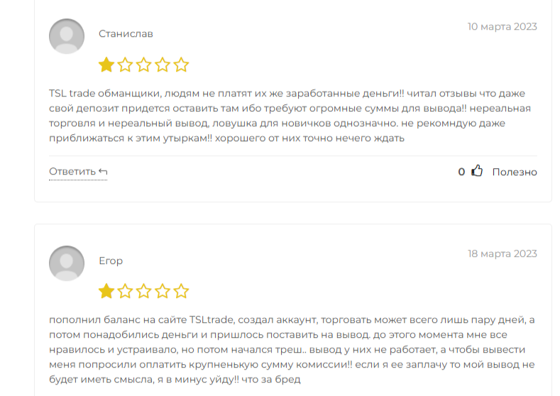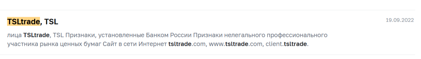 Брокерской деятельностью посредник TSLtrade занимался около года. За время своей работы он не получил позитивных отзывов от довольных трейдеров. Никто в сети не похвалил низкие комиссии, удобную платформу, выгодные тарифы или компетентность саппорта.