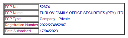 Основным фактором предоставляющим гарантию того, что вложенные средства будут в сохранности и их не придется потерять является законодательство. На сайт сказано, что организацией Turlov Family Office Securities Pty Ltd была получена лицензия южноафриканской комиссии. В ходе проверки выяснилось что это соответствует действительности и подтверждение этому можно отыскать на сайте указанной комиссии.