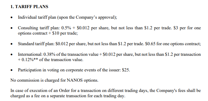 Как правило, комиссия составляет $0.012 за акцию, но не менее $1.2 за сделку. Есть также дополнительные платежи, они варьируется в зависимости от тарифа. Тем, кто захочет создать свой кошелек на платформе настоятельно рекомендуется полностью ознакомится с этим документом.