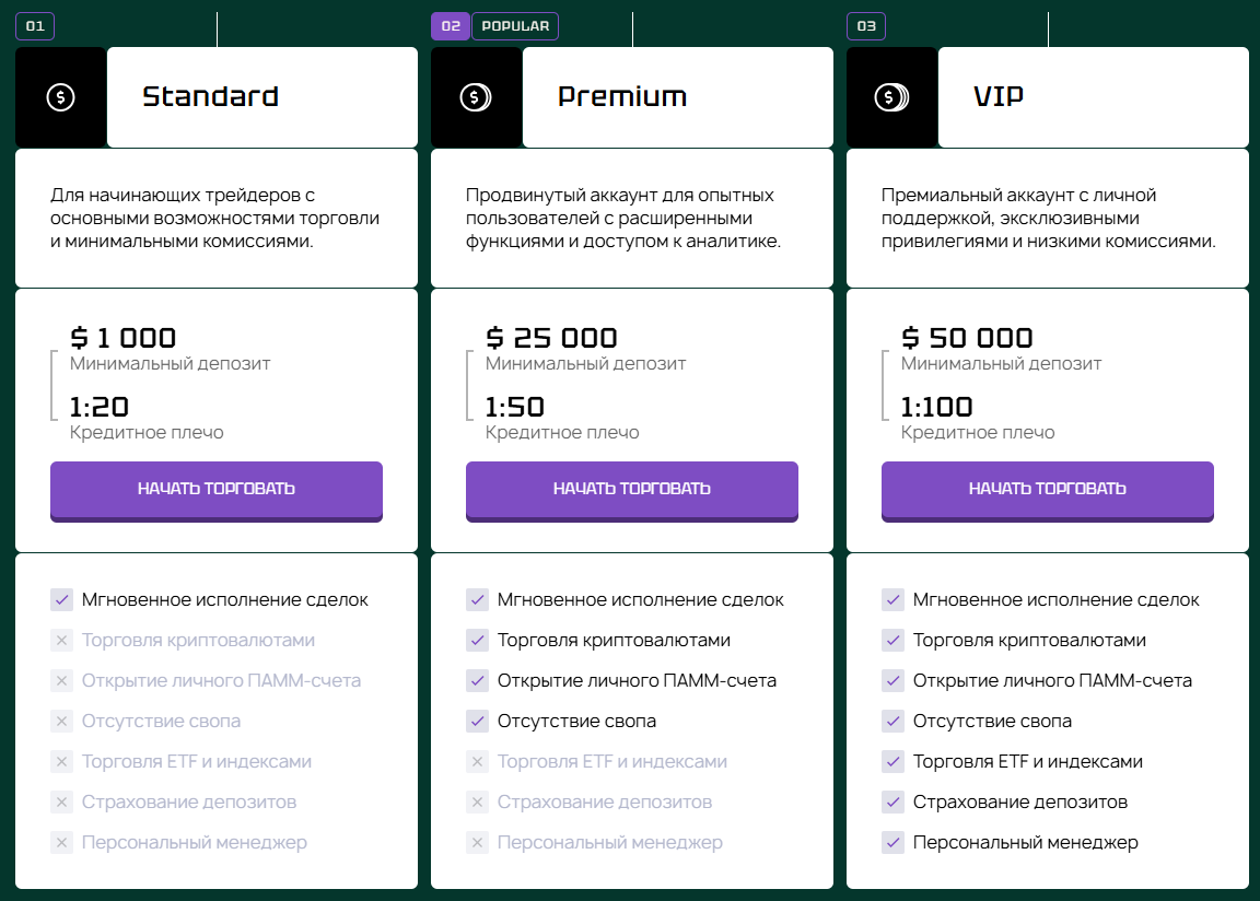 Брокер предоставляет трейдерам три тарифа Standard, Premium и VIP. На базовом депозите необходимо пополнить баланс минимум на 1000 долларов. О торговых условиях практически ничего не сказано, нет данных о спредах и прочем, указано лишь максимальное кредитное плечо и дополнительные опции тарифа.