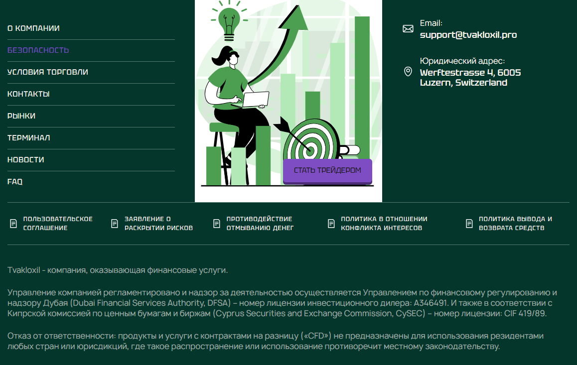 - деятельность брокерской организации «ТваклоКсил» не регулируется, отсутствие лицензий лишает трейдеров защиты финрегуляторов;