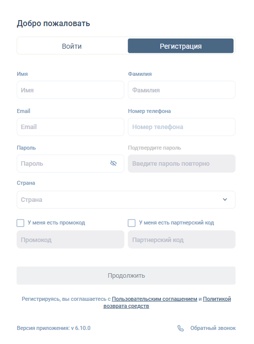 Торговый терминал доступен с домена Tvaklo xil world, для работы на нем необходима регистрация аккаунта. У проекта имеется реферальная программа с партнерскими кодами, а также промокоды для более выгодного открытия счета.