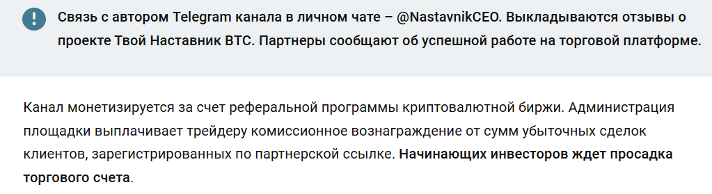 Хоть трейдер и не предлагает что-то покупать, риски при сотрудничестве с ним довольно высокие, да и на сторонних источниках некоторые считают, что при сотрудничестве может присутствовать развод, поэтому мы не рекомендуем связываться с владельцем проекта «Твой Наставник | Btc».
