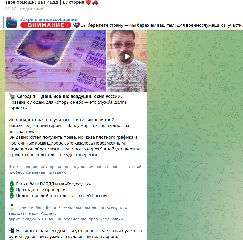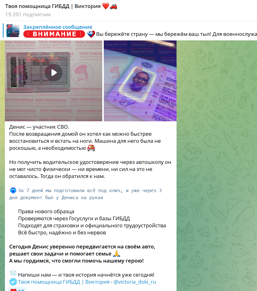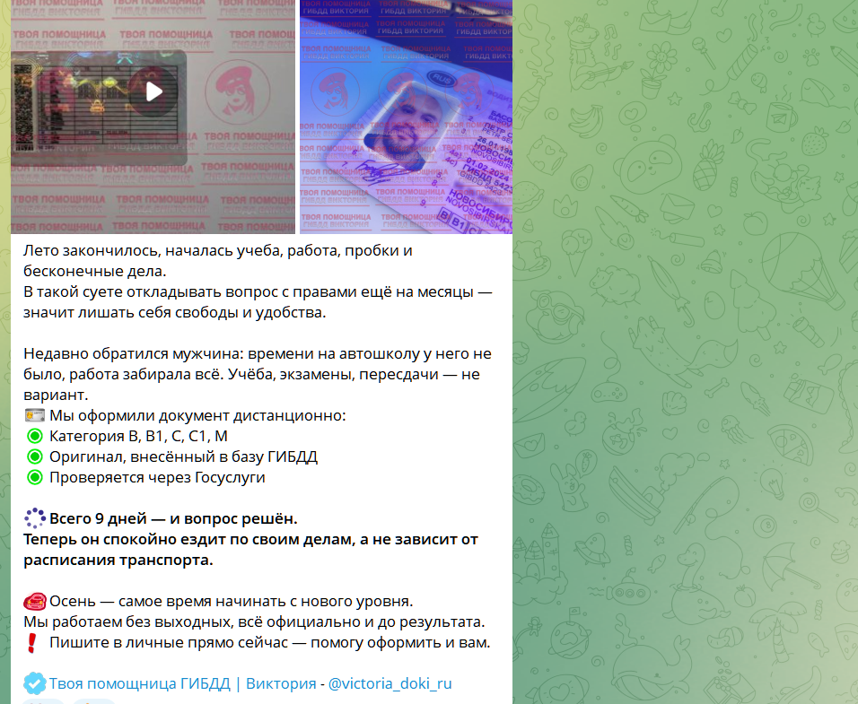 Фейковая услуга по выдаче официальных водительских прав в ТГ канале victoria doki ru