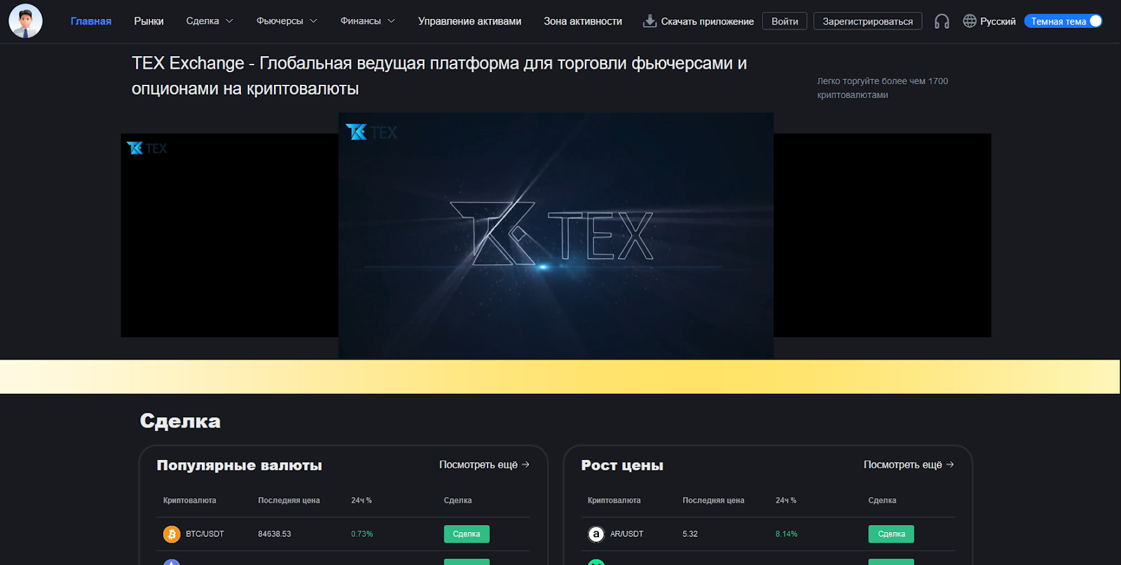 При переходе на главную страницу открываются короткие видео презентации, ниже полезная информация по рынку и проекту в целом. Но главное — это навигационное меню сверху, где можно переходить к рынкам и сделкам, управлять своими активами и учетной записью.
