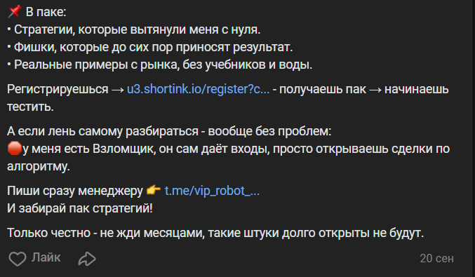 В сети практически отсутствуют отзывы о проекте, кроме некоторых упоминаний вроде поста во ВКонтакте, да и то, никаких обсуждений платформы нет, а просто написано, что автор обещает дать какую-то стратегию, если зарегистрироваться на сайте по его ссылке.