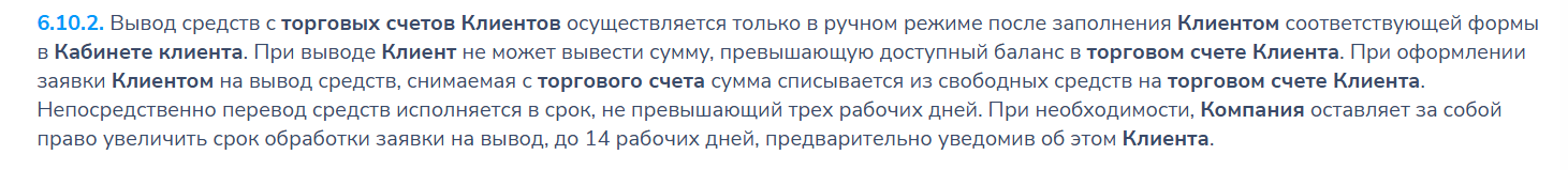 Вывод средств может блокироваться до 14 дней, а при расторжении договора вообще придется ждать около месяца, причем владельцы запрещают распространять любую негативную информацию о себе.