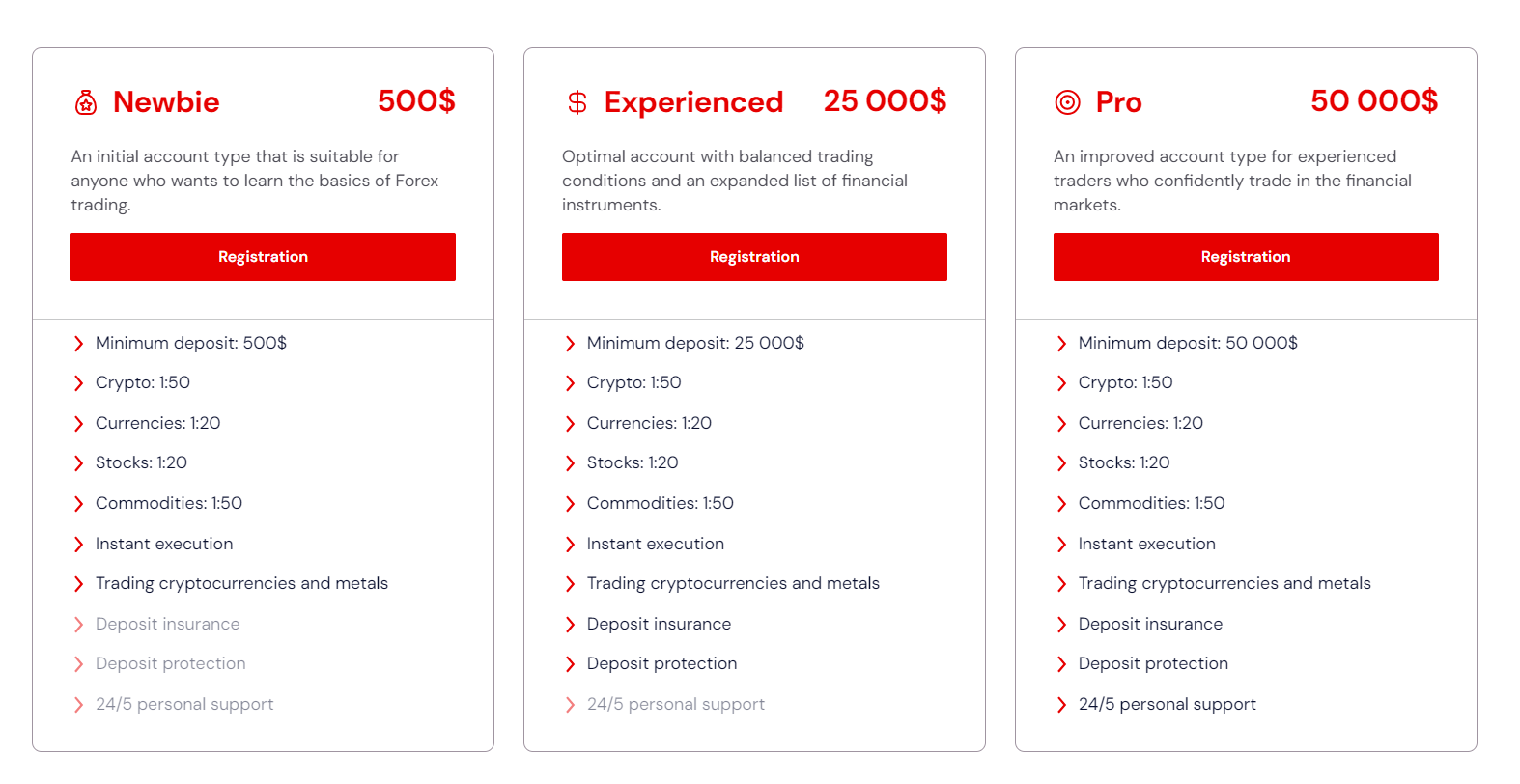 • Новичок. Минимальный депозит — 500$. Сделки исполняются мгновенно. Также открывается доступ к криптовалютам и металлам;