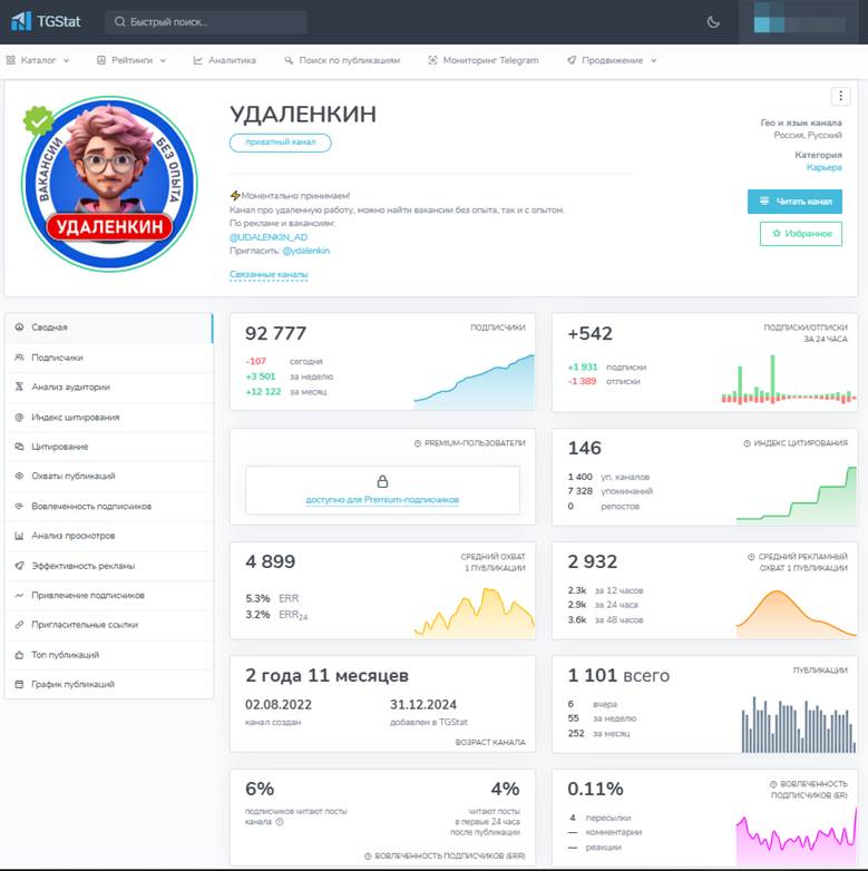 «Удаленкин» в Телеграме собрал более 92,7 тысяч подписчиков и их количество стабильно растет. Статистика просмотров демонстрирует, что оперативно просматривают сообщения 4% от участников, а общее число просмотров составляет не более 6%. Это показывает, что использована значительная накрутка ботами. Комментарии и реакции к постам отключены, администрацию не интересует мнение пользователей, возможно они его даже опасаются.