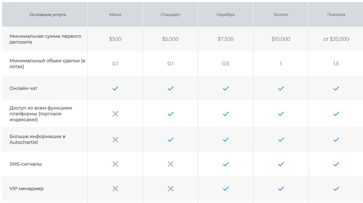- Платина. Счет доступен для клиентов, готовых инвестировать как минимум 35 000 долларов.