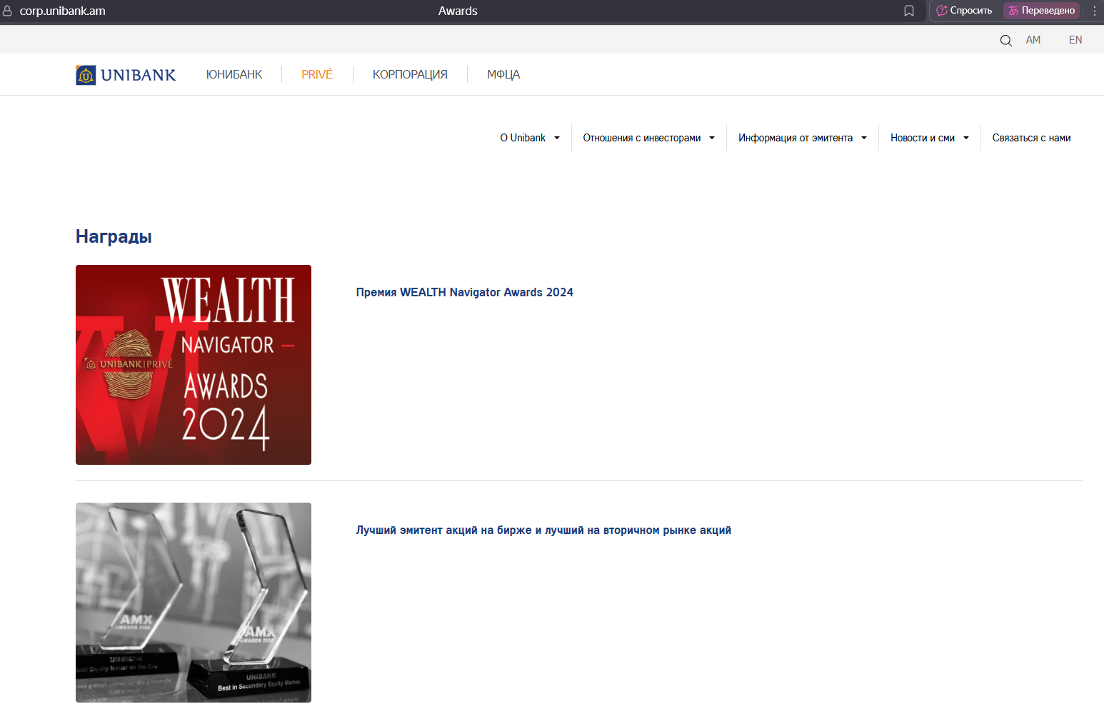 Unibank am имеет множество наград, на сайте указываются 17 штук, например: «Лучший банк Армении» по версии Global Banking & Finance Awards, 2022, «Лучший цифровой банк» по версии международных изданий и пр.