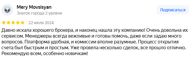- независимые источники утверждают о положительном опыте работы с брокером, отмечаю простоту открытия счёта и адекватные комиссии, что говорит о хорошем уровне сервиса.