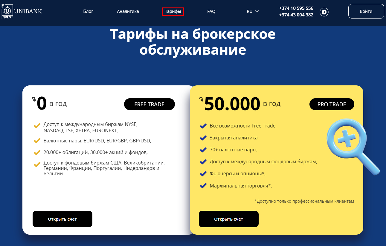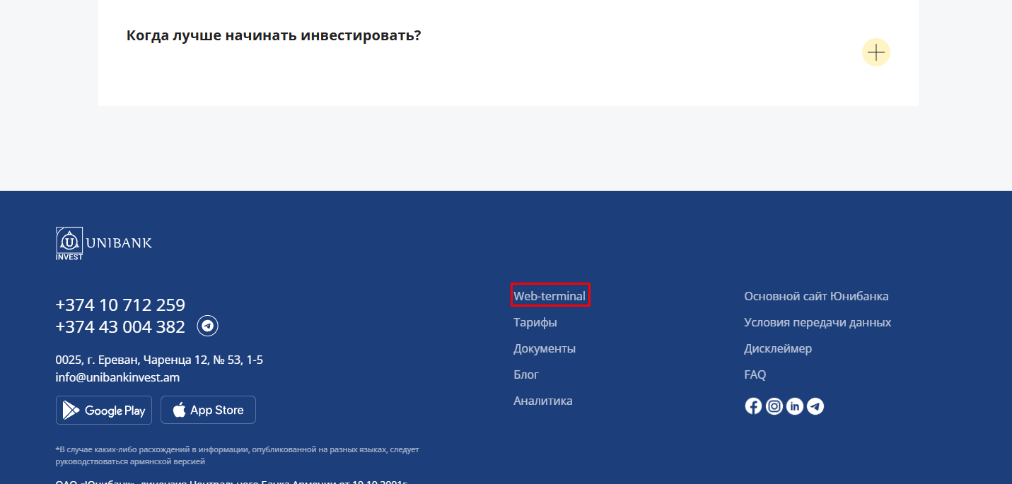 - брокер UnibankInvest регулируется со стороны Армянского ЦБ, что делает его надёжным партнёром для инвестиций, особенно если вы являетесь резидентом Армении;