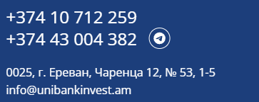 Для инвестиционных вопросов у Unibank Invest есть отдельная почта – invest@unibank am, другая же – info@unibank am, предназначена для решения общих вопросов. Ещё можно прийти лично, в любой из офисов «Юнибанк», где вам помогут решить любой вопрос.