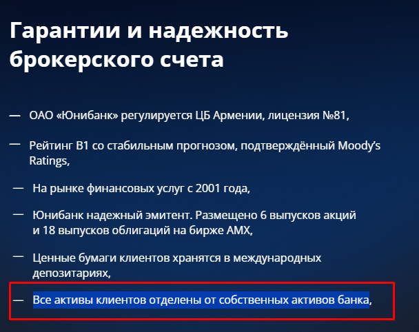 Клиентам важно знать, куда поступают их деньги – на корпоративные счета или на личные кошельки владельцев. В Unibank Invest ваши активы поступают на отдельные корпоративные счета, они отделены от собственных активов «Юнибанка», так утверждается на сайте брокера.