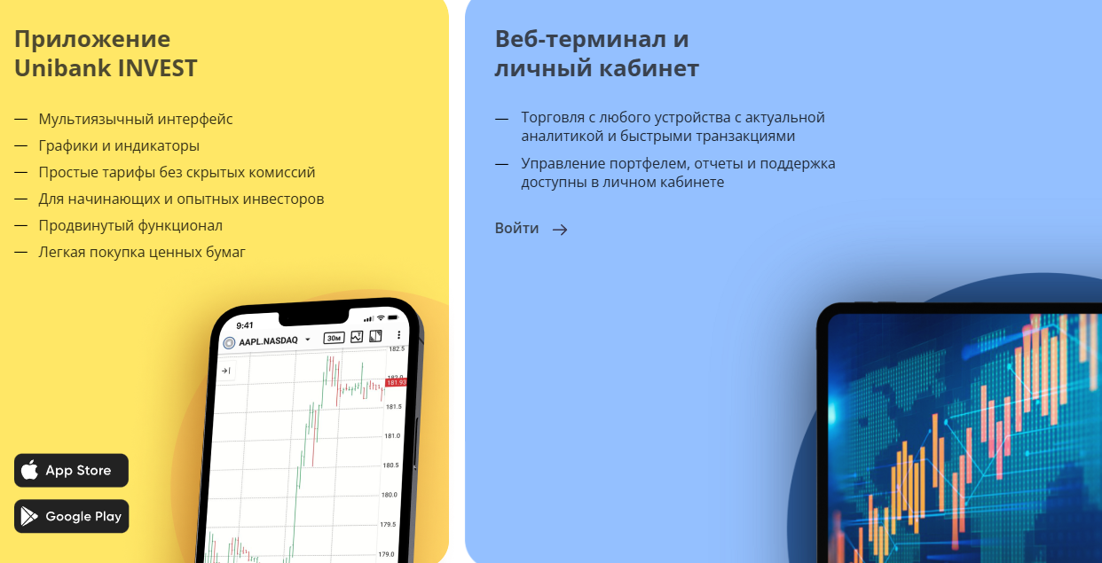 Unibank Invest позволяет торговать такими активами, как: ценные бумаги, акции, облигации, валютные пары, CFD, ETF, криптовалюта и тд.