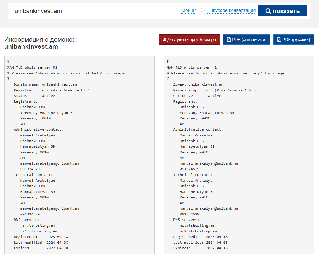 Домен UnibankInvest am существует недавно, по сведения с WhoIs, сайт был зарегистрирован в апреле 2023 года, действует до 2027.