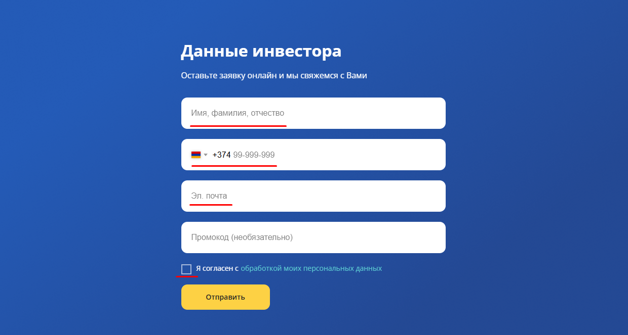 Чтобы завести брокерский счёт, клиенту необходимо найти графу с заполнением данных инвестора, что находится в середине главной странице. Придётся ввести своё ФИО, номер телефона, e-mail почту, пройти регистрацию сразу не получится.